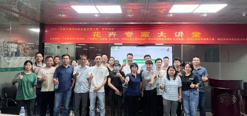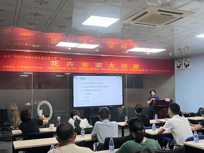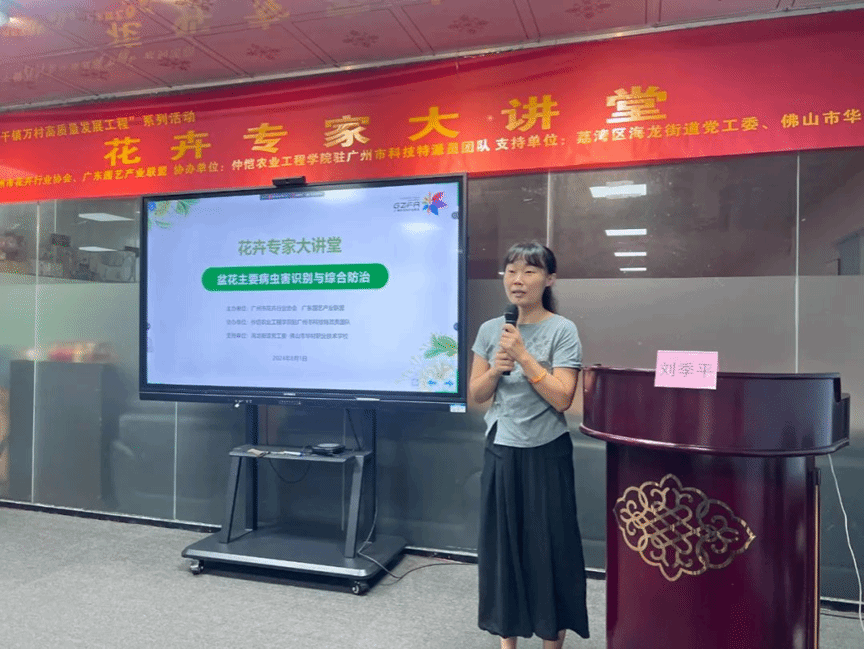 2024年8月1日,广州市科技特派员团队赴广州大观园艺科技有限公司开展一场主题为《盆花主要病虫害识别与综合防治》培训讲座。此次培训由广州市花卉行业协会梁文婷主持,特别邀请了仲恺农业工程学院程东美副教授主讲。吸引了众多盆花种植者和相关从业人员参与。