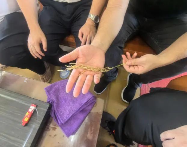 在汕头市鑫雄种植有限公司再生稻种植基地,公司负责人周昭雄介绍了再生稻的基本情况,为了有效的安排周年轮作,让水稻生产和冬种蔬菜能有效衔接,提高周年生产效益,在仲恺团队指导下,今年首次开展连片再生稻种植试验,受八九月份台风、强降雨等自然因素影响,水稻出现稻瘟病、穗上发芽等症状。陈教授指出,近期要利用好晴朗天气,综合评估成熟度以后,适时收获,在以后的实践中,可以考虑通过田间控水的方式,控制再生稻无效分蘖,保证再生稻抽穗齐整,株型合理,产量有保障。