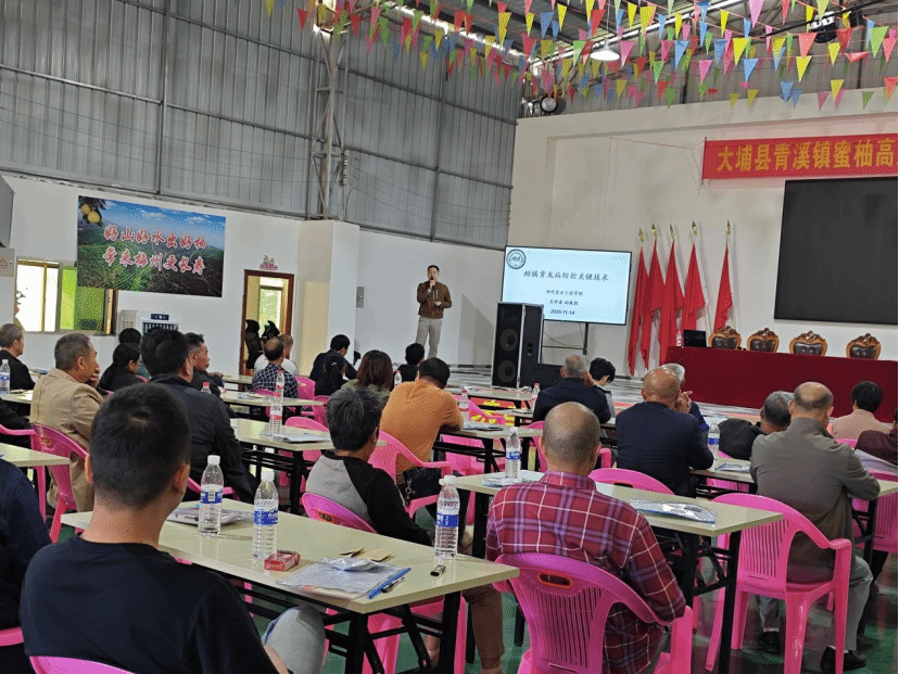 为切实解决蜜柚种植户在病害防控和冬季管理中的技术难题,助力果农稳产提质、增收致富,11 月 14 日上午,仲恺农业工程学院驻青溪镇农村科技特派员团队张姿丽、赖惠玲、丘金霞在青溪镇高峰农业发展公司柚园举办蜜柚种植核心技术专题培训会,会议邀请仲恺农业工程学院吴仲真副教授和大埔县农业农村服务中心房锦川高级农艺师做专题报告和现场培训。培训会由青溪镇驻镇工作队队长陈怡主持,分管农业副镇长饶良浩以及驻镇工作队队员和部分政府工作人员,当地40多名蜜柚种植户、合作社技术骨干踊跃参与了培训。