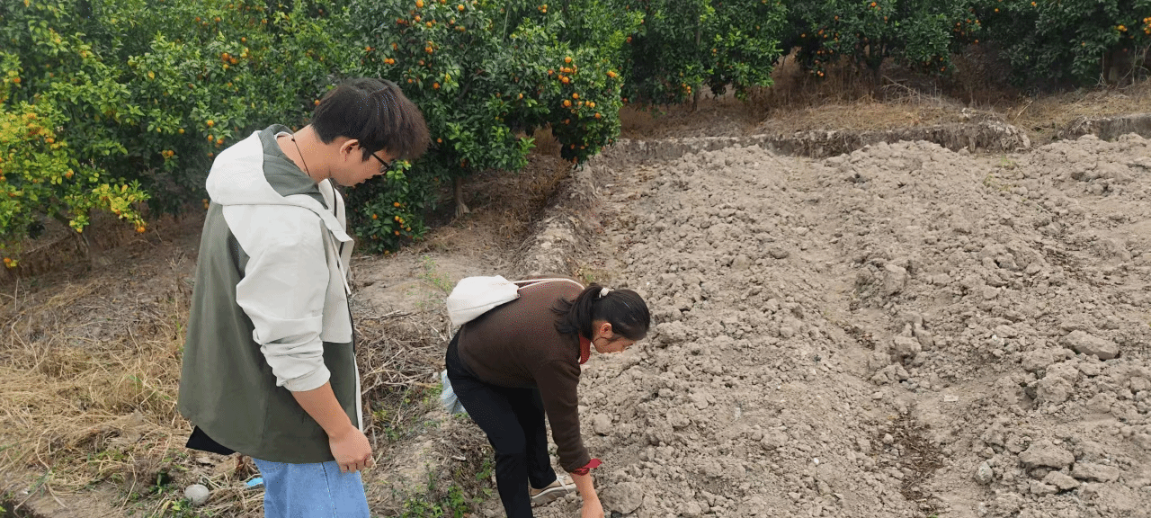 来到三坑村,杨静美团队和工作队队长杨梅、村支书周文、双头村驻村书记梁浩欣等商谈了三坑村作为典型村的后续发展工作。杨静美提出可以在该村绿化带、田园周边尝试种植紫云英、三叶草等,既能美化乡村容貌,又能将其作为绿肥,改善生态环境。杨梅队长对科技特派员提出的美化、增肥双重增效思路表示赞同,表示待气温高时可进行尝试。来到田间,红红的沙糖桔挂满枝头。杨静美仔细观察了当地的土质,表示土地肥力尚可,适合种植绿肥作物。但果园里的沙糖桔有些枝条黄的亮眼,杨静美告诉大家,这是典型的黄龙病症状,需要及时砍掉发黄感病的树枝,防止黄龙病蔓延。
