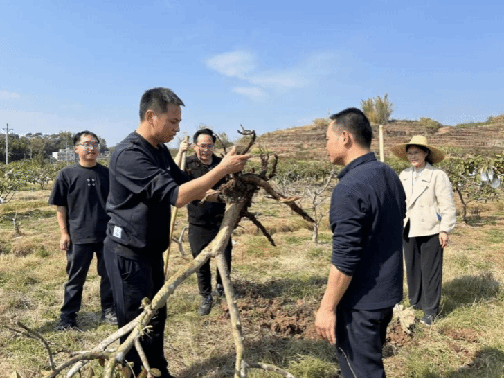 午间,日升中天,暑气渐浓,团队马不停蹄赶赴生江镇榃兵村番石榴种植基地。刚入园中,便发现了果树烂根、叶片枯黄的问题。团队成员拨开土壤探寻症结,俯身细察发现部分果树根系已然腐烂发黑,严重威胁着番石榴的产量与品质。结合广东省大力推广的果树绿色高效栽培技术,徐彪教授一语道破关键。他认为田间积水导致土壤透气性差,正是番石榴烂根的罪魁祸首。为此,他建议当务之急是开挖排水沟渠,疏通积水梗阻现象。同时,增施腐熟有机肥,改良土壤的呼吸环境;对轻症果树喷施生根壮苗剂,助力根系重焕生机。王傅副教授提出来用生物制剂搭配土壤调理方案,增强果树抗病能力,减少化学药剂使用。刘汉波副教授结合相关政策要求与乡村治理传统文化,提出要建立果园管护责任到户的机制,明确种植户的管护职责与奖惩标准,以精细化管理激活番石榴种植的内生动力。