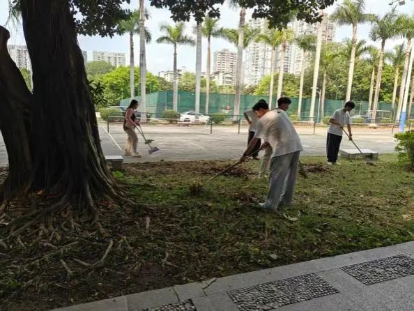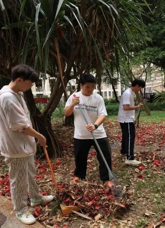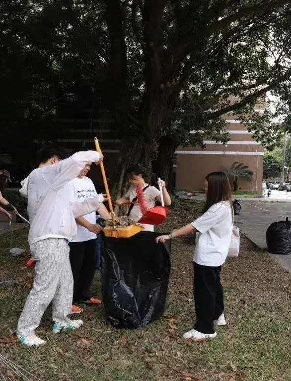 活动聚焦学生社区环境美化,以南区D栋宿舍楼及周边公共区域为重点。参与者手持扫帚、垃圾夹等工具,分组对宿舍楼草坪的落叶、杂物进行彻底清理,并细致打扫楼道、走廊等公共空间。党员和积极分子们分工协作,展现出饱满的热情和团结协作的精神风貌,不仅改善了社区环境,更以身体力行的方式传递了“奉献、友爱、互助、进步”的志愿服务理念。