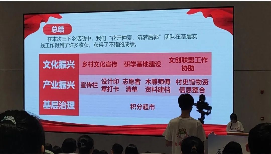 在“百千万工程”突击队及“三下乡”社会实践团队优秀示范项目成果展示环节中,“花开仲夏,筑梦后郭”暑期“三下乡”社会实践团是第一个进行汇报的团队,队长yl88858永利集团种科211班邱丹妍同学代表团队从文化振兴、产业振兴和基层治理三个方面介绍了团队在龙湖镇后郭村的实践工作。她通过图文和视频的形式,充分展示了团队在过去一个月里所取得的实践成果。