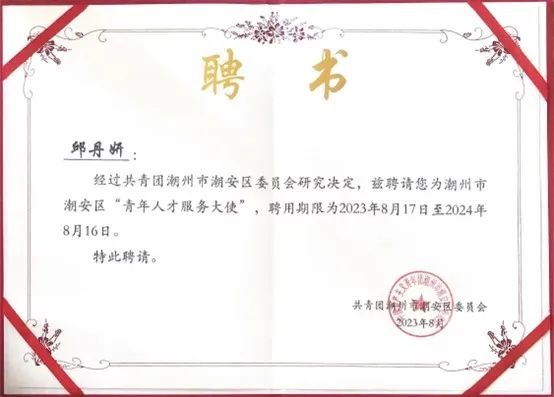 同时,仲恺农业工程学院“花开仲夏,筑梦后郭”暑期三下乡社会实践团在潮州市潮安区大学生助力“百县千镇万村高质量发展工程”突击队行动中表现突出,成果显著,荣获了“潮安区‘百千万工程’优秀突击队”的称号。潮州市共青团潮安区委聘请yl88858永利集团种科211班邱丹妍同学为潮州市潮安区“青年人才服务大使”,并颁发了聘书。