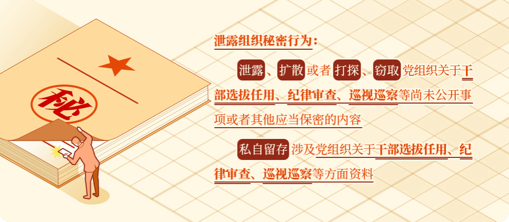 《中国共产党纪律处分条例》第一百四十四条对泄露组织秘密行为作出了处分规定。泄露、扩散或者打探、窃取党组织关于干部选拔任用、纪律审查、巡视巡察等尚未公开事项或者其他应当保密的内容的,给予警告或者严重警告处分;情节较重的,给予撤销党内职务或者留党察看处分;情节严重的,给予开除党籍处分。私自留存涉及党组织关于干部选拔任用、纪律审查、巡视巡察等方面资料,情节较重的,给予警告或者严重警告处分;情节严重的,给予撤销党内职务处分。