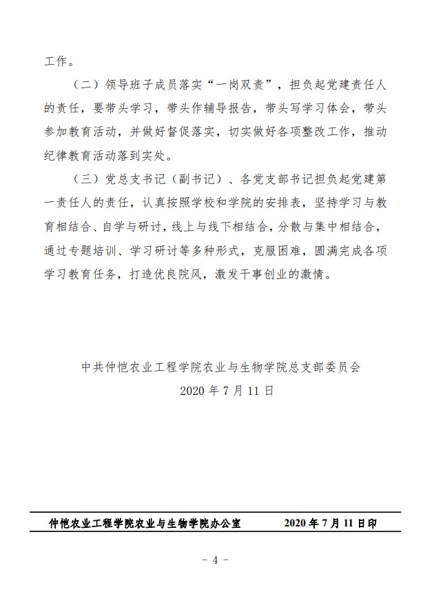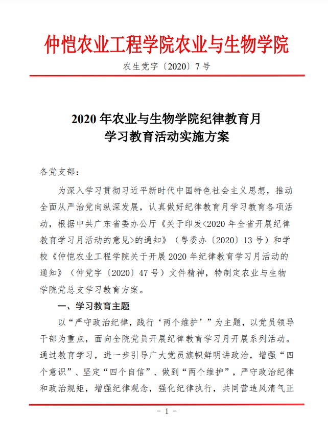 农生党字〔2020〕7号-2020年yl88858永利集团纪律教育月学习活动方案