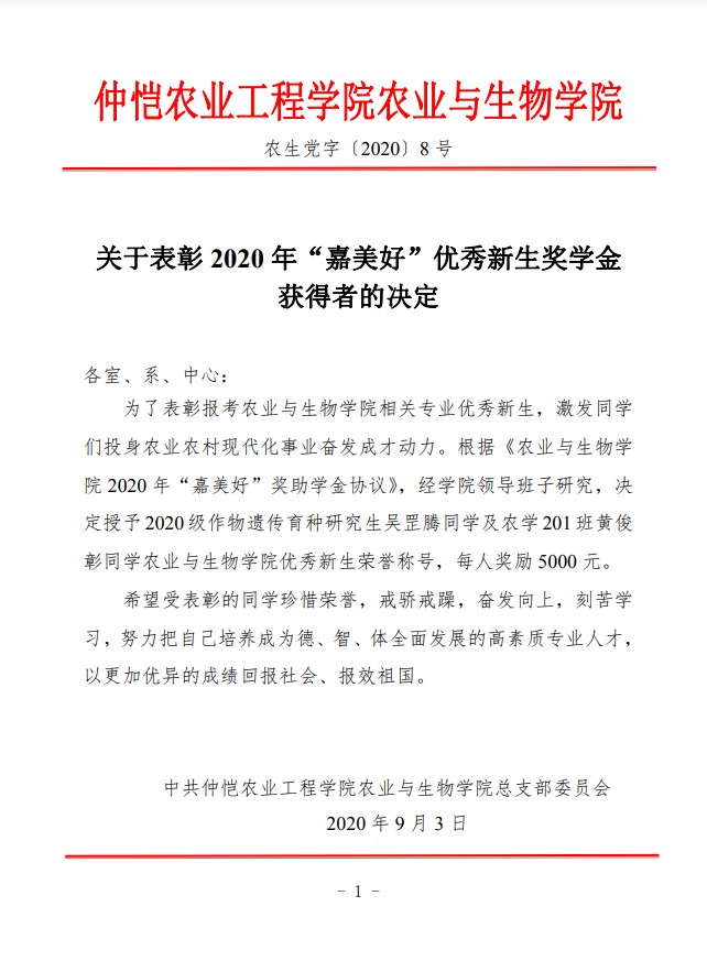 农生党字〔2020〕8号-关于表彰2020年“嘉美好”优秀新生奖学金获得者的决定