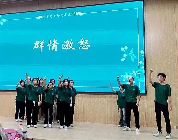 随后,中草药231班以巴黎和会引发五四运动为故事背景带来一场情景剧表演和演唱《夜空中最亮的星》。当他们齐声高喊“爱我中华、保卫祖国”时,洪亮的声音、整齐划一的动作,无不深深地感染着现场每一位观众。在他们的激情演绎下,现场无处不弥漫着浓浓的爱国之情。展示结束后,现场瞬间响起了雷鸣般的掌声。