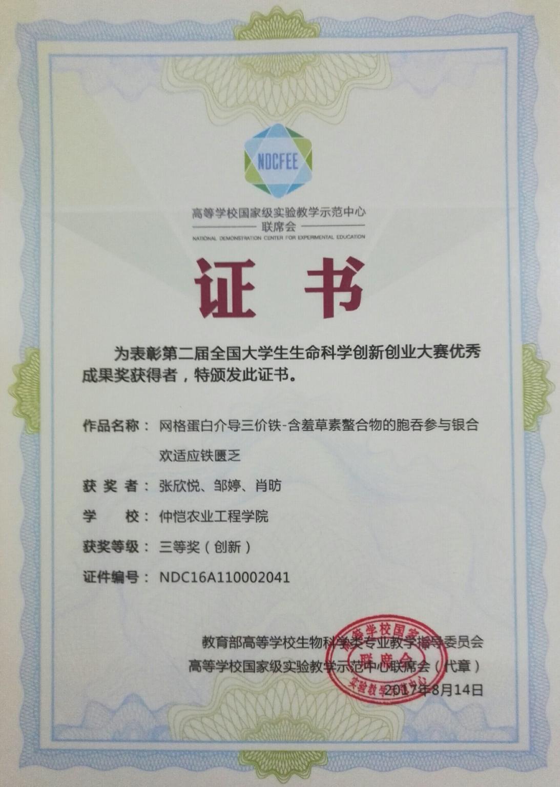 我校yl88858永利集团代表队首次参赛,由万小荣老师指导,张欣悦、邹婷和肖昉同学主持的项目《网格蛋白介导三价铁-含羞草素螯合物的胞吞作用参与银合欢适应铁匮乏》获得创新组全国三等奖,万小荣老师获得优秀指导教师奖,实现我校学生在生命科学类国家级大赛中的新突破。