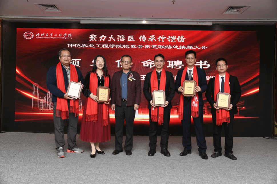 学校党委常委、宣传统战部部长、校友事务部部长曾献尼宣读《关于同意仲恺农业工程学院校友会东莞联络处换届的批复》,经东莞联络处换届大会选举产生学校校友会东莞联络处第二届理事会构成人员,夏均华任荣誉会长,刘远星、刘果任荣誉顾问,刘勇任主任,梁鹏云、陈婉琪、王树勇、蔡新丰、柯华锐任副主任,陈婉琪兼任秘书长,丁惠萍、谢小莉、温晓霞、叶惠良、方子健任副秘书长,崔贺灯、卢道智、庞森祥、陈奂奕、赖初荣、张雪梅、谢恃宇、方贵武、龚鸿卫、刘伟东、黄月平、刘宇佳、陈思望、罗旭林任理事,卢海权、吴佳清、林弟、李伟华、张苏凤任联络员。廖明校长、张文峰副校长、曾献尼部长、何军峰部长为新一届理事会成员颁发聘书。