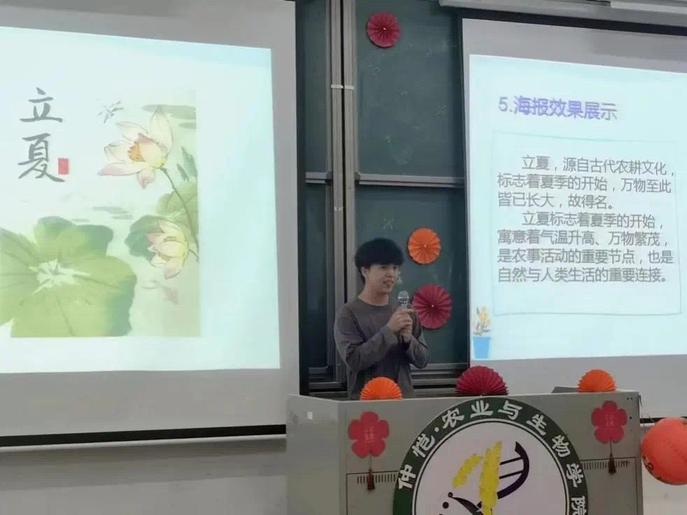 紧接着是第二组参赛队伍:梨园曲团队以国粹京剧为主题来设计《华夏瑰宝》海报,还为观众们现场带来了一首《赤伶》,空灵婉转的戏腔让人不禁沉醉其中;五指山队、汪汪大队和敲锣噜队三支队伍同样选择了以二十四节气为主题,分别展现了《荷塘夜梦》、《夏满》和《雁归冷暖,秋向平》三幅海报,风格不一、各领风骚,敲锣噜队还以小品的方式生动演绎了秋分节气,别开生面,乐趣纵生。